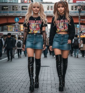 二人とも黒いエナメルのロングブーツを履いていた。膝上まである艶やかなブーツは、光を反射して妖しく輝き、細いヒールが地面をカツカツと鳴らす。タイトなミニスカートから伸びる脚線美と、ブーツのエロティックな質感が、彼女たちの雰囲気を一層危険で魅力的に見せていた。上半身は露出度の高いトップスで、胸の谷間が強調されている。化粧も濃いめで、唇は艶やかに赤く、目は獲物を狙うように細められていた。